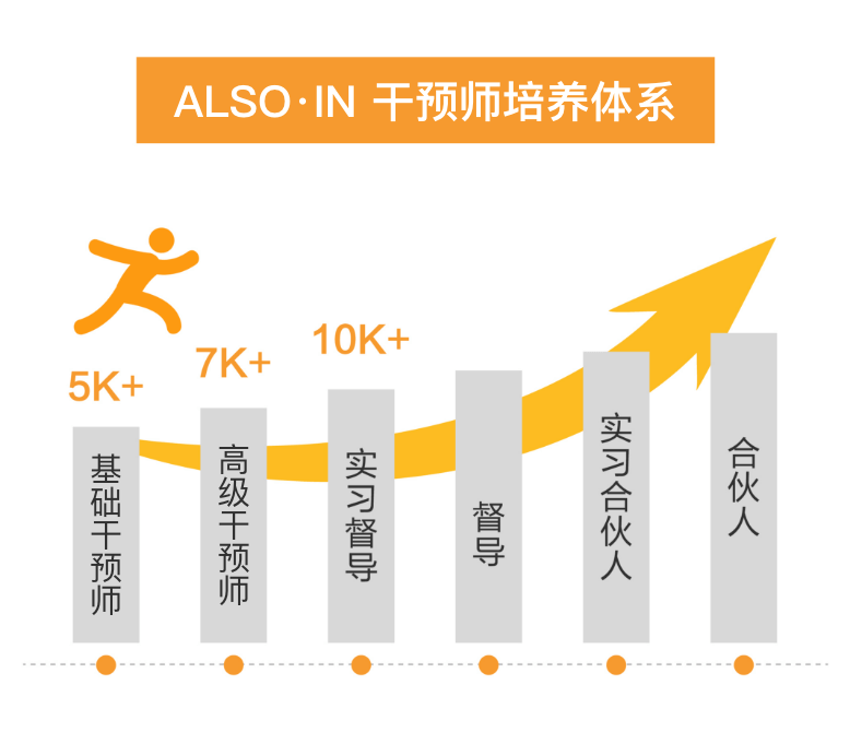 从基础干预师起步,随着业务的精进和努力的学习,未来可以升级至高级干预师、实习督导、督导、实习合伙人至合伙人,踏上一条阶梯式个人职业成长的赛道。